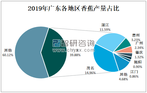 从2019年广东各地区香蕉种植情况来看,广东省香蕉种植分布与产量分布基本一致,香蕉种植面积最多的地区为茂名,种植面积达到44.43万亩,香蕉产量为174.34万吨;其次为湛江,种植面积为43.18万亩,产量为135.13万吨。