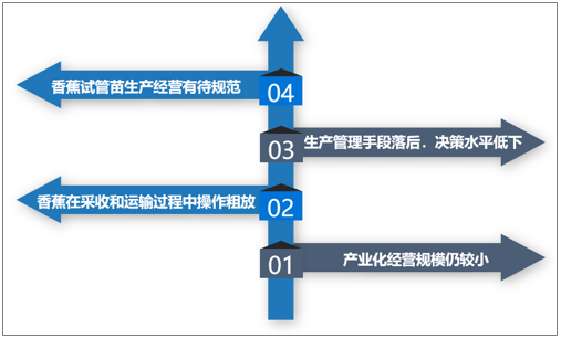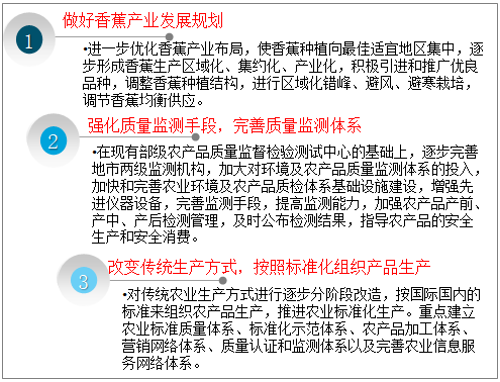 为解决上述产业所存在的问题,广东省政府应做好香蕉发展规划;强化质量检测手段,完善质量检测体系;改变传统生产方式,按照标准化组织产品生产。