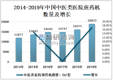 智研咨询发布的《2021-2027年中国煎药机产业竞争现状及投资前景分析报告》显示:2014-2019年中国中医类医院煎药机数量呈增长趋势,2019年中国中医类医院煎药机数量18833台/套,比上年增加2758台/套,同比增长17.16%。