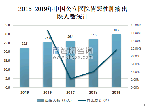 胃肿瘤是消化系统常见疾病,胃恶性肿瘤包括胃癌、恶性淋巴瘤和恶性间质瘤等。以胃癌最为常见,其发生率在消化道恶性肿瘤中居首位。胃肿瘤很少出现症状,有的因肿瘤生长较大发生并发症或恶变后才发生症状,所以易被忽略,因此,目前我国胃恶性肿瘤的早期诊断率仍较低。近年来中国公立医院胃恶性肿瘤出院人数逐年增,2019年中国公立医院胃恶性肿瘤出院人数达30.2万人,较2018年增加了2.65万人,同比增长9.67%。