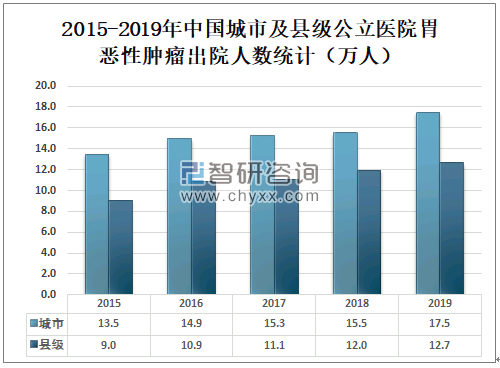 2019年中国城市公立医院胃恶性肿瘤出院人数为17.5万人,较2018年增加了2万人;县级公立医院胃恶性肿瘤出院人数为12.7万人,较2018年增加了0.7万人。