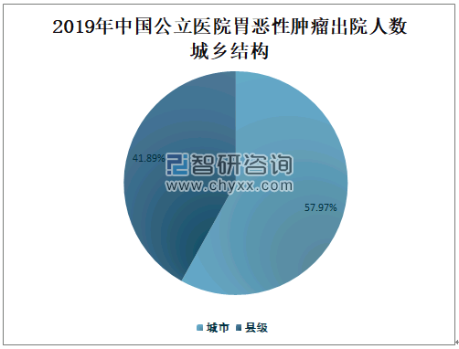 2019年中国城市公立医院胃恶性肿瘤出院人数占总出院人数的57.97%,占比较大;2019年中国县级公立医院胃恶性肿瘤出院人数占总出院人数的41.89%,占比较小。
