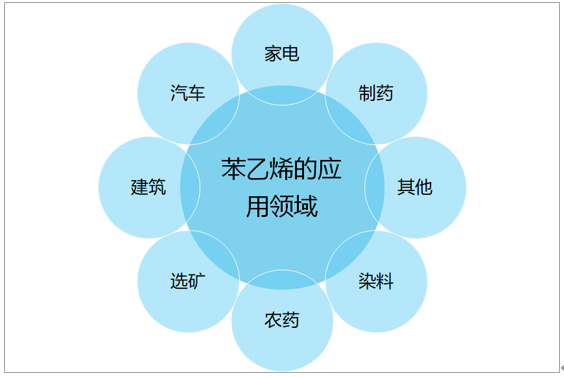 苯乙烯作为大宗基础化工原料,下游产品广泛用于建筑、家用电器和汽车工业。最重要的用途是作为合成橡胶和塑料的单体,用来生产丁苯橡胶、聚苯乙烯、泡沫聚苯乙烯;也用于与其他单体共聚制造多种不同用途的工程塑料。如与丙烯腈、丁二烯共聚制得ABS树脂,广泛用于各种家用电器及工业上;与丙烯腈共聚制得的SAN是耐冲击、色泽光亮的树脂;与丁二烯共聚所制得的SBS是一种热塑性橡胶,广泛用作聚氯乙烯、聚丙烯的改性剂等。此外,苯乙烯还可用于制药、染料、农药以及选矿等行业。