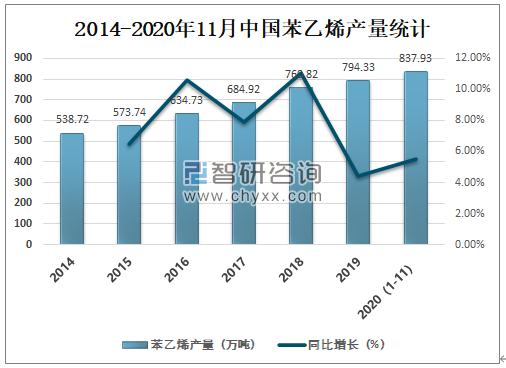 2014-2020年11月中国苯乙烯产量统计