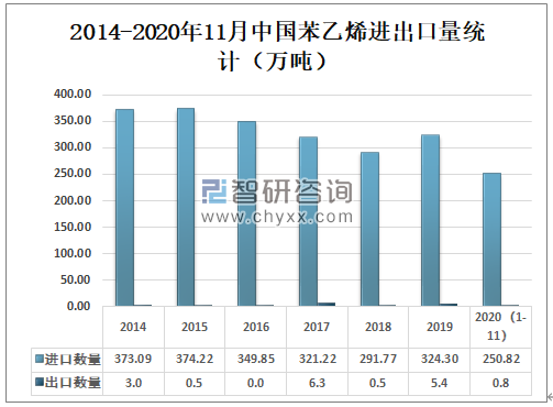 2014-2020年11月中国苯乙烯进出口量统计
