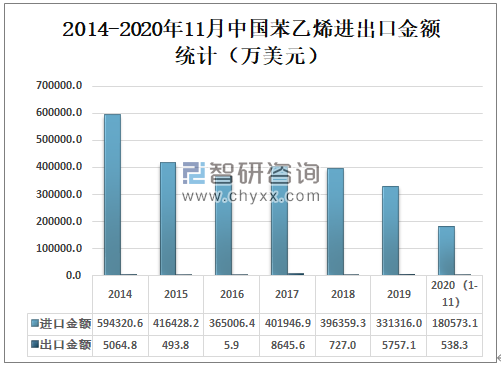 2014-2020年11月中国苯乙烯进出口金额统计
