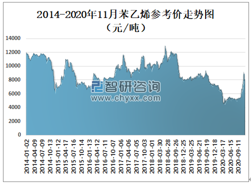 2014-2020年11月苯乙烯参考价走势图(元/吨)
