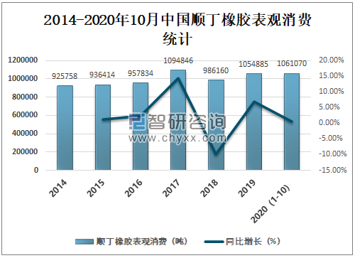 总体来看中国顺丁橡胶表观消费呈增长趋势,2019年中国顺丁橡胶表观消费为1054885吨,较2018年增加了68725吨,同比增长6.97%,2020年1-10月中国顺丁橡胶表观消费为1061070吨。