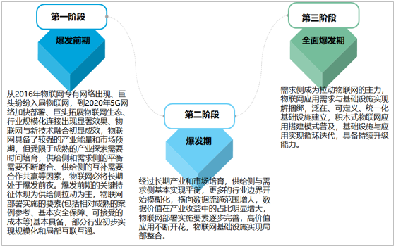 全球物联网安全的推进力度持续加码。随着物联网规模化应用不断落地,物联网安全事件频出,物联网安全成为应用方决策是否部署物联网应用的关键要素,对物联网进一步规模化拓展产生重大影响。各国政府及物联网产业巨头均高度重视物联网安全。2018年前,各国物联网安全策略均以自愿性、政策文件等方式推进,2018)年之后主流国家策略发生重大改变,国家对物联网安全监管力度更具强制性。美国通过《物联网网络安全改进法案》,要求政采物联网设备必须遵守安全性建议,对向政府提供物联网设备的承包商和经销商采用漏洞披露政策。日本从2019年起在全国开展“面向物联网清洁环境的国家行动”,在不通知设备所有者的情况下强制测试全国物联网终端设备的安全性。英国发布《消费类物联网设备行为安全准则》13条,推进安全认证,提出物联网产品和服务零售商应仅销售具有安全认证标签的消费型物联网产品,其后又将13条中的3条纳入立法。综上所述,全球物联网正处于高速发展的关键期,市场潜力也被产业界广泛认可,从核心技术支撑和关键特征来看,物联网规模化会经历三个发展期。