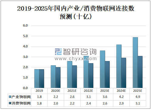 2019-2025年国内产业/消费物联网连接数预测(十亿)