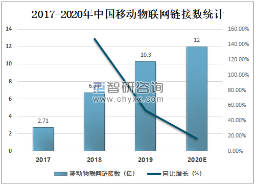智研咨询发布的《2021-2027年中国物联网行业市场运营态势及投资机会分析报告》数据显示:2019年中国产业物联网连接数为1.8十亿,预计2020年将达到2.2十亿;2019年中国消费物联网连接数为1.8十亿,预计2020年将达到2十亿。