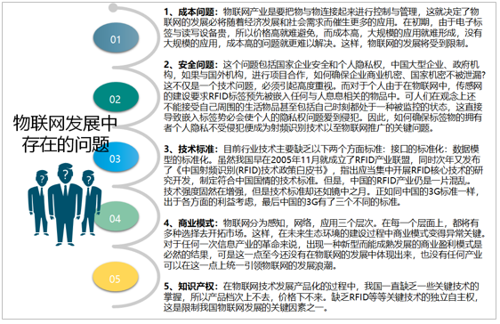 物联网从提出到今天,用途已十分广泛,中国也有很多地方用上了物联网技术,如,上海浦东国际机场防入侵系统、济南园博园中的路灯控制系统、2010年上海世博园区中的罗森便利店中的会说话的饭盒以及世博园内的门票、监控系统等都已依赖于物联网技术的使用。当然,物联网在发展过程中也存在着一些问题,这些问题不解决,将影响物联网的普及与发展。目前存在的问题主要是有以下几个方面。