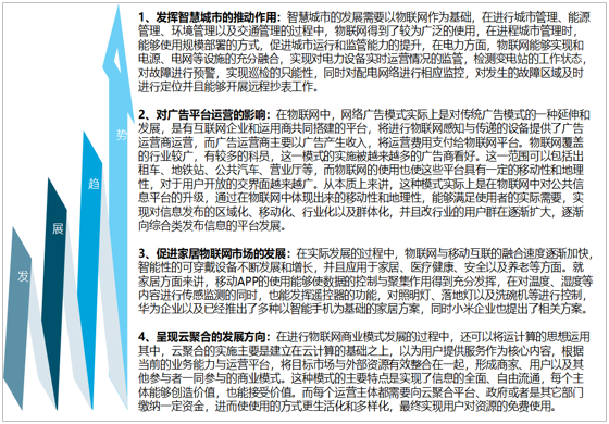 未来物联网的发展趋势的主要包括以下四个方面:(1)发挥智慧城市的推动作用(2)对广告平台运营的影响(3)促进家居物联网市场的发展(4)呈现云聚合的发展方向。