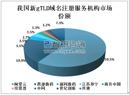 截至2019年12月,我国新gTLD域名注册服务机构阿里云、西部数码、新网数码分别在全球gTLD域名注册服务机构排名第一、第二和第三位,分别占全球gTLD的59.5%、19.9%、3.1%。