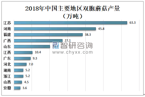 2018年江苏双胞蘑菇产量为63.3万吨,占全国总产量的25.47%;河南双胞蘑菇产量为45.8万吨,占全国总产量的18.44%;福建双胞蘑菇产量为38.3万吨,占全国总产量的15.44%。
