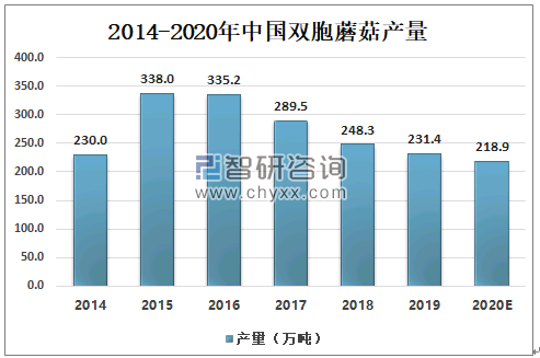 2014-2020年中国双胞蘑菇产量