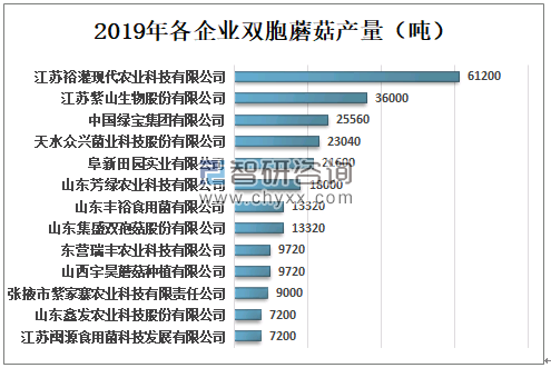 2019年江苏裕灌现代农业科技有限公司双孢蘑菇产量为61200吨,江苏紫山生物股份有限公司双孢蘑菇产量为36000吨,中国绿宝集团有限公司双孢蘑菇产量为25560吨。