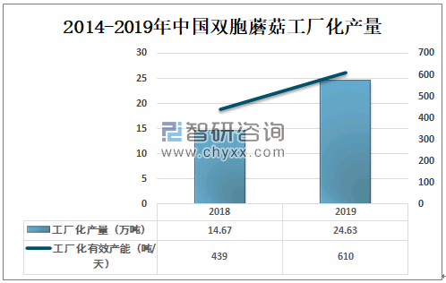 智研咨询发布的《2021-2027年中国双孢蘑菇行业市场研究分析及投资战略规划报告》数据显示:2018年中国双孢蘑菇工厂化产量为14.67万吨,工厂化有效产能为439吨/天;2019年中国双孢蘑菇工厂化产量为24.63万吨,工厂化有效产能为610吨/天。
