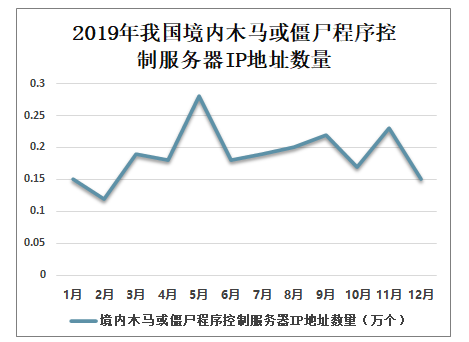 相关报告:智研咨询发布的《2021-2027年中国计算机行业运行动态及投资前景评估报告》2019年我国境内木马或僵尸程序控制服务器IP地址数量呈波动态势,5月达到最高值0.28万个,2月为最低值0.12万个。