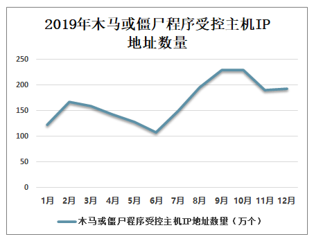 2019年木马或僵尸程序受控主机IP地址数量总体呈现下降态势,10月达到最高值229.19万个,6月为最低值107.3万个。