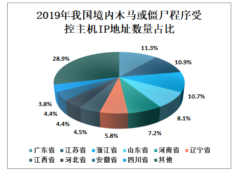 按地域分布,2019年我国境内木马或僵尸程序受控主机IP地址数量占比排名前三位的为广东省、江苏省和浙江省,占比分别是11.3%、10.9%、10.7%。