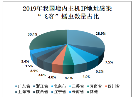 按地域分布,2019年我国境内主机IP地址感染“飞客”蠕虫数量占比排名前三位的省市分别是广东省、浙江省和北京市,占比分别是28.9%、7.5%、6.2%。