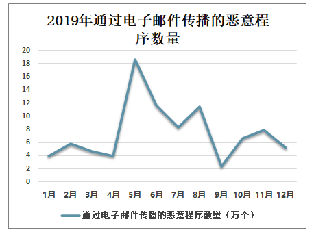 恶意程序传播的常用途径之一是电子邮件,2019年捕获通过电子邮件传播的恶意代码90.31万个,其中5月达到最高值18.61万个,9月为最低值2.35万个。
