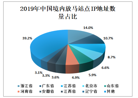 按地域分布,2019年我国境内放马IP地址数量占比排名前三位的为浙江省、广东省、江苏省,占比分别是14%、10.7%、8.7%。