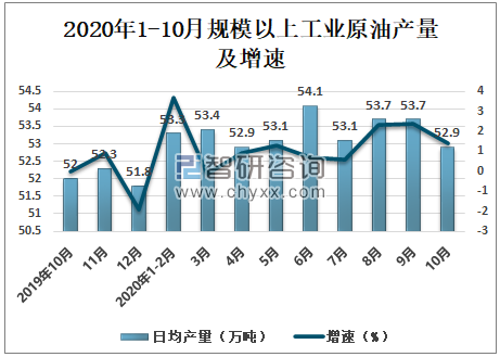 智研咨询发布的《2021-2027年中国能源产业竞争现状及未来前景分析报告》数据显示:我国原油生产增速略有放缓,加工有所加快。2020年10月我国生产原油1641万吨,同比增长1.4%,增速比上月回落1.0%;日均原油产量52.9万吨,较上月减少0.8万吨。