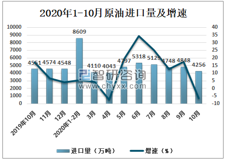 我国原油进口增速由正转负,2020年10月我国进口原油4256万吨,较上月减少592万吨,同比下降6.5%,上月为增长17.6%;2020年1-10月我国进口原油45858万吨,同比增长 10.6%。