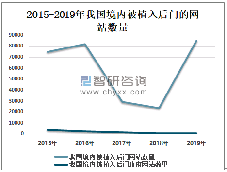 2019年我国境内被植入后门网站数量为84850个,较2018年增加61242个;其中被植入后门政府网站数量有717个,较2018年增加43个。