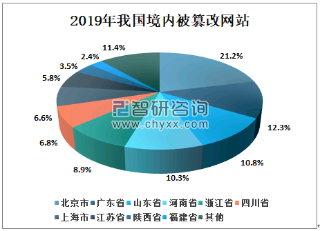 随着互联网行业快速发展,发生网页被篡改的事件次数较多。按地域分布,2019年我国境内被篡改网站数量占比前10位的地区分别是北京市、广东省、山东省、河南省、浙江省、四川省、上海市、江苏省、陕西省和福建省,其中北京市、广东省、山东省占比分别是21.2%、12.3%、10.8%。
