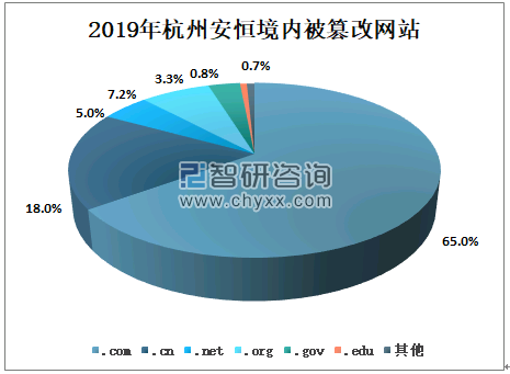 按其域名所属顶级域占比分布,2019年杭州安恒监测境内被篡改网站占比排名前三位的域名类型为.com、.cn和.net,占比分别是65%、18%、5%。