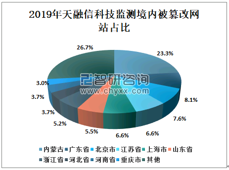 按地区分布,2019年天融信科技监测年境内被篡改网站占比排名前三位的是内蒙古自治区、广东省和北京市,占比分别是23.3%、8.1%、7.6%。