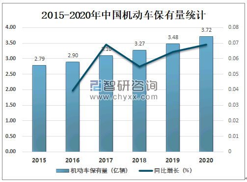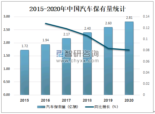 智研咨询发布的《2021-2027年中国汽车行业竞争格局分析及投资前景规划报告》数据显示:2020年中国汽车保有量达2.81亿辆,较2019年增加了0.21亿辆,同比增长8.08%。