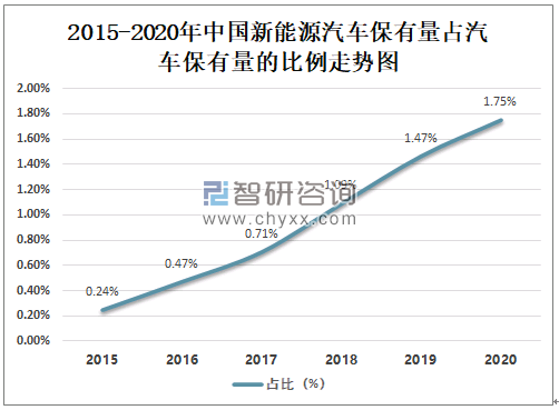 中国新能源汽车保有量占汽车保有量的比例持续增长,2020年中国新能源汽车保有量占汽车保有量的1.75%,较2019年增加了0.29%,预计未来将继续保持增长。