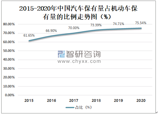 2015-2020年中国汽车保有量占机动车保有量的比例走势图(%)
