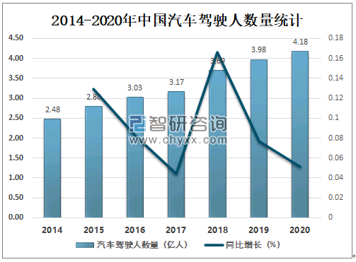 2020年中国汽车驾驶人数量达4.18亿人,较2019年增加了0.2亿人,同比增长5.15%。