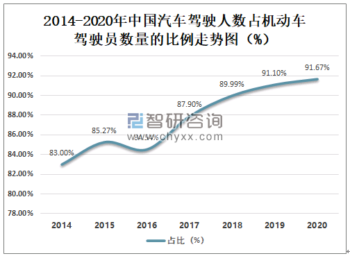 2014-2020年中国汽车驾驶人数占机动车驾驶员数量的比例走势图(%)