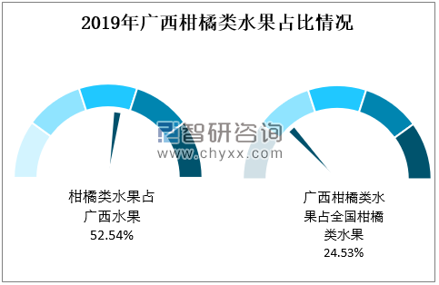 2019年广西柑橘类水果占广西水果总产量的52.54%,广西柑橘类水果占全国柑橘类水果总产量的24.53%。