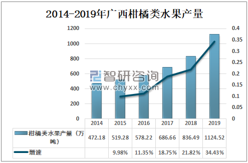 2019年广西柑橘类水果产量为1124.52万吨,较2018年增加了288.03万吨,同比增长34.43%。