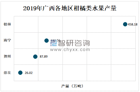 广西桂林柑橘类水果居榜首,2019年广西桂林柑橘类水果产量为458.18万吨,占广西总产量的40.74%;南宁柑橘类水果产量为133.56万吨,占广西总产量的11.88%;贺州柑橘类水果产量为87.89万吨,占广西总产量的7.82%。