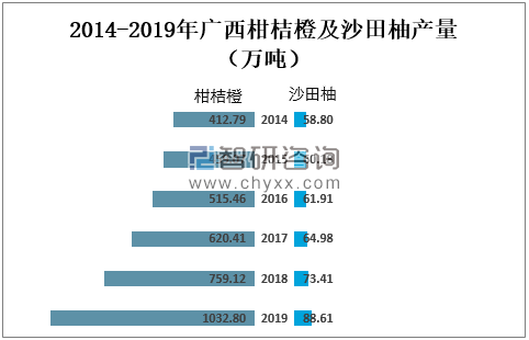 2019年广西柑桔橙产量为1032.80万吨,占柑橘类水果总产量的91.84%;广西沙田柚产量为88.61万吨,占柑橘类水果总产量的24.53%。