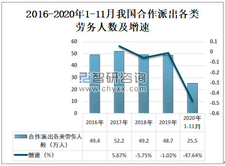 2016-2020年1-11月我国合作派出各类劳务人数及增速