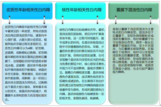 白内障主要有皮质性年龄相关性白内障、核性年龄相关性白内障和囊膜下混浊性白内障,他们的临床表现如下。