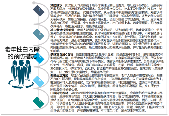 老年性白内障的病因较多,症状表现多样,若早期诊断并治疗,能够取得较理想的治疗效果。通过佩戴深色眼镜、预防脱水、多吃维生素C类食物、保持健康习惯和口服阿司匹林等方法能够有效预防该病。