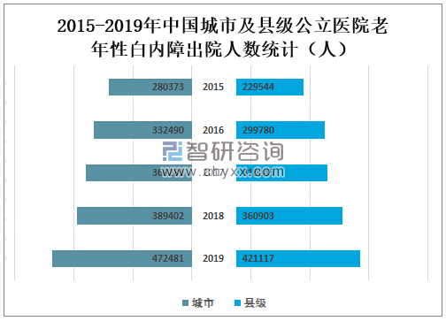 2019年中国城市公立医院老年性白内障出院人数达472481人,较2018年增加了83079人;县级公立医院老年性白内障出院人数达421117人,较2018年增加了60214人。
