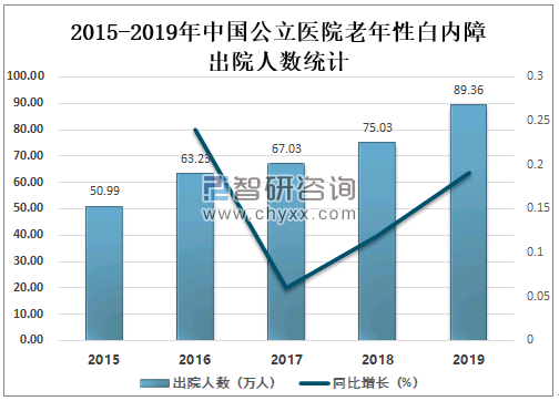 从临床研究来看,白内障是一种具有较高发病率的眼科疾病,且具有较高的致盲率,其病发人群主要以中老年人为主,目前主要通过手术的方式来解决,而药物尚无有效地治愈白内障或完全阻止或延缓白内障的发展。近年来中国公立医院老年性白内障出院人数持续增加,2019年中国公立医院老年性白内障出院人数达89.36万人,较2018年增加了14.33万人,同比增长19.10%。