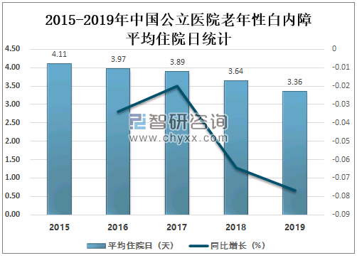 随着中国医疗水平的不断提升,中国公立医院老年性白内障平均住院日逐年减少,2019年中国公立医院老年性白内障平均住院日为3.36天,较2018年减少了0.28天,同比减少7.69%。