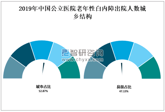 2019年中国城市公立医院老年性白内障出院人数占总出院人数的52.87%,占比较大;县级公立医院老年性白内障出院人数占总出院人数的47.13%,占比较小。